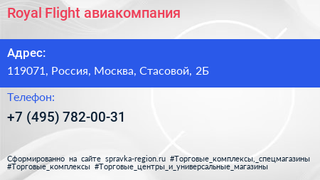 Royal Flight, авиакомпания по адресу 119071, Россия, Москва, Стасовой, 2Б в дальнейшем Организация, размещена в следующих категориях:
