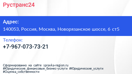 Рустранс24 по адресу 140053, Россия, Москва, Новорязанское шоссе, 6 ст5 в дальнейшем Организация, размещена в следующих категориях: