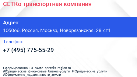 СЕТКо, транспортная компания по адресу 105066, Россия, Москва, Новорязанская, 28 ст1 в дальнейшем Организация, размещена в следующих категориях: