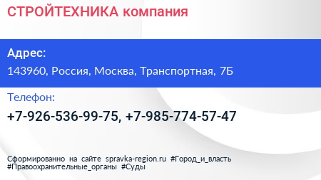 СТРОЙТЕХНИКА, компания по адресу 143960, Россия, Москва, Транспортная, 7Б в дальнейшем Организация, размещена в следующих категориях: