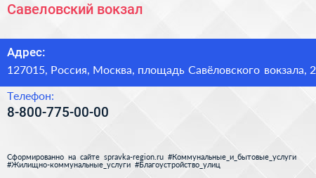 Савеловский вокзал по адресу 127015, Россия, Москва, площадь Савёловского вокзала, 2 в дальнейшем Организация, размещена в следующих категориях: