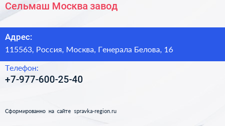 Сельмаш Москва, завод по адресу 115563, Россия, Москва, Генерала Белова, 16 в дальнейшем Организация, размещена в следующих категориях: