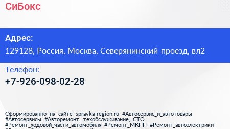 СиБокс по адресу 129128, Россия, Москва, Северянинский проезд, вл2 в дальнейшем Организация, размещена в следующих категориях: