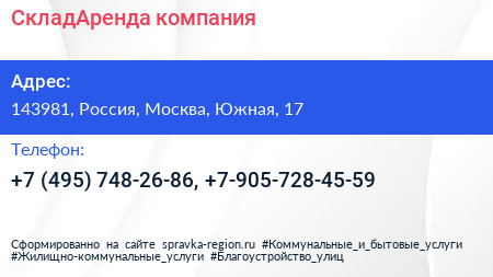 СкладАренда, компания по адресу 143981, Россия, Москва, Южная, 17 в дальнейшем Организация, размещена в следующих категориях: