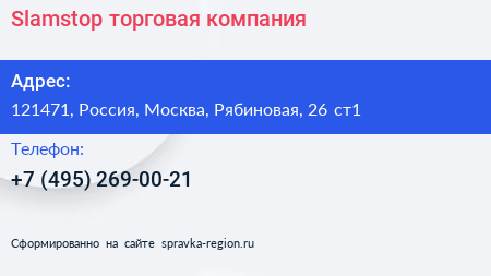 Slamstop, торговая компания по адресу 121471, Россия, Москва, Рябиновая, 26 ст1 в дальнейшем Организация, размещена в следующих категориях: