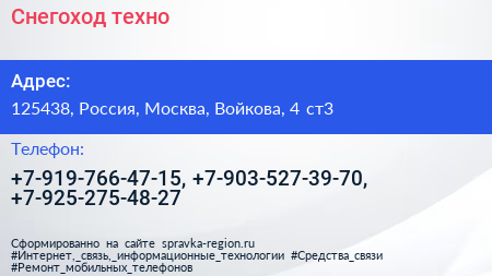 Снегоход-техно по адресу 125438, Россия, Москва, Войкова, 4 ст3 в дальнейшем Организация, размещена в следующих категориях: