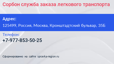 Сорбон, служба заказа легкового транспорта по адресу 125499, Россия, Москва, Кронштадтский бульвар, 35Б в дальнейшем Организация, размещена в следующих категориях:
