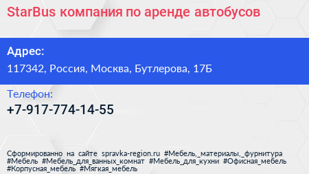 StarBus, компания по аренде автобусов по адресу 117342, Россия, Москва, Бутлерова, 17Б в дальнейшем Организация, размещена в следующих категориях:
