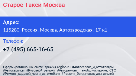 Старое Такси Москва по адресу 115280, Россия, Москва, Автозаводская, 17 к1 в дальнейшем Организация, размещена в следующих категориях: