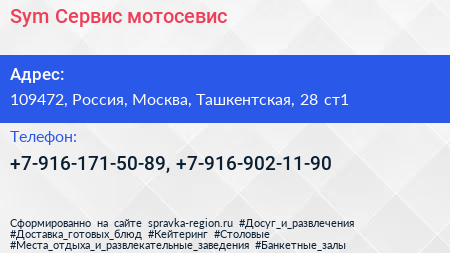Sym Сервис, мотосевис по адресу 109472, Россия, Москва, Ташкентская, 28 ст1 в дальнейшем Организация, размещена в следующих категориях: