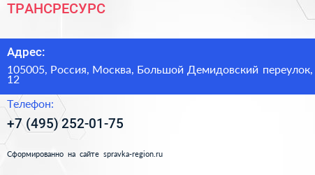 ТРАНСРЕСУРС по адресу 105005, Россия, Москва, Большой Демидовский переулок, 12 в дальнейшем Организация, размещена в следующих категориях: