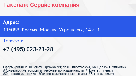 Для связи с организацией воспользуйтесь номером телефона: +7 (495) 023-21-28. Пн: c 09:00-18:00, Вт: c 09:00-18:00, Ср: c 09:00-18:00, Чт: c 09:00-18:00, Пт: c 09:00-18:00, Сб: выходной, Вс: выходной, вы можете обратиться в эту организацию.