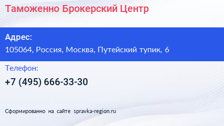 Таможенно-Брокерский Центр по адресу 105064, Россия, Москва, Путейский тупик, 6 в дальнейшем Организация, размещена в следующих категориях: