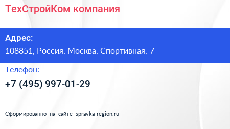 ТехСтройКом, компания по адресу 108851, Россия, Москва, Спортивная, 7 в дальнейшем Организация, размещена в следующих категориях: