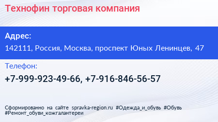 Технофин, торговая компания по адресу 142111, Россия, Москва, проспект Юных Ленинцев, 47 в дальнейшем Организация, размещена в следующих категориях: