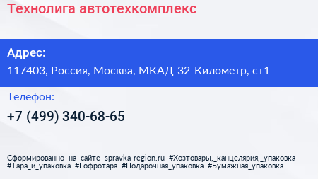 Технолига, автотехкомплекс по адресу 117403, Россия, Москва, МКАД 32 Километр, ст1 в дальнейшем Организация, размещена в следующих категориях: