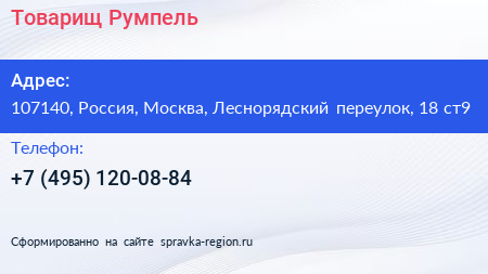 Товарищ Румпель по адресу 107140, Россия, Москва, Леснорядский переулок, 18 ст9 в дальнейшем Организация, размещена в следующих категориях: