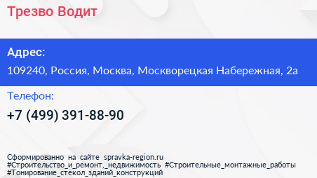 Трезво Водит по адресу 109240, Россия, Москва, Москворецкая Набережная, 2а в дальнейшем Организация, размещена в следующих категориях: