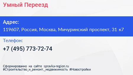 Умный Переезд по адресу 119607, Россия, Москва, Мичуринский проспект, 31 к7 в дальнейшем Организация, размещена в следующих категориях: