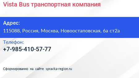 Vista Bus, транспортная компания по адресу 115088, Россия, Москва, Новоостаповская, 6а ст2а в дальнейшем Организация, размещена в следующих категориях: