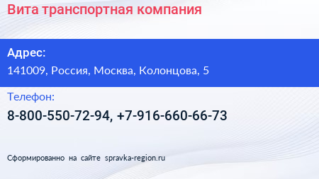 Вита, транспортная компания по адресу 141009, Россия, Москва, Колонцова, 5 в дальнейшем Организация, размещена в следующих категориях: