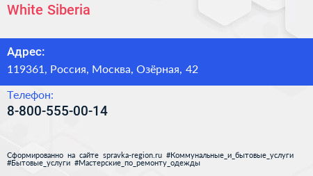 White Siberia по адресу 119361, Россия, Москва, Озёрная, 42 в дальнейшем Организация, размещена в следующих категориях: