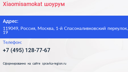 Xiaomisamokat, шоурум по адресу 119049, Россия, Москва, 1-й Спасоналивковский переулок, 19 в дальнейшем Организация, размещена в следующих категориях: