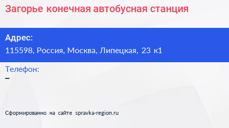 Загорье, конечная автобусная станция по адресу 115598, Россия, Москва, Липецкая, 23 к1 в дальнейшем Организация, размещена в следующих категориях: