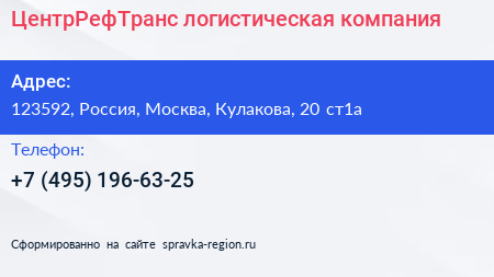 ЦентрРефТранс, логистическая компания по адресу 123592, Россия, Москва, Кулакова, 20 ст1а в дальнейшем Организация, размещена в следующих категориях:
