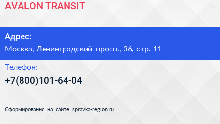 AVALON TRANSIT по адресу Москва, Ленинградский просп., 36, стр. 11 в дальнейшем Организация, размещена в следующих категориях: