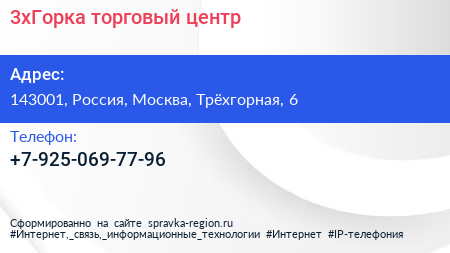 3хГорка, торговый центр по адресу 143001, Россия, Москва, Трёхгорная, 6 в дальнейшем Организация, размещена в следующих категориях: