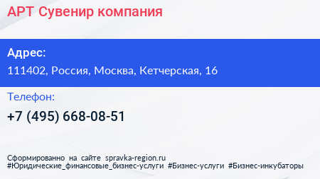 АРТ-Сувенир, компания по адресу 111402, Россия, Москва, Кетчерская, 16 в дальнейшем Организация, размещена в следующих категориях: