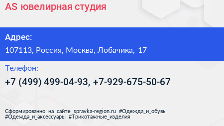 AS, ювелирная студия по адресу 107113, Россия, Москва, Лобачика, 17 в дальнейшем Организация, размещена в следующих категориях: