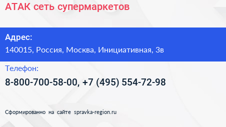 АТАК, сеть супермаркетов по адресу 140015, Россия, Москва, Инициативная, 3в в дальнейшем Организация, размещена в следующих категориях: