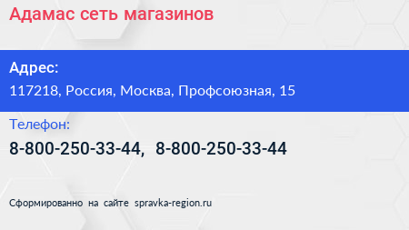 Адамас, сеть магазинов по адресу 117218, Россия, Москва, Профсоюзная, 15 в дальнейшем Организация, размещена в следующих категориях: