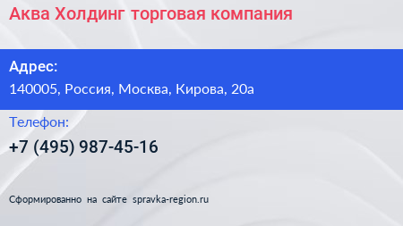 Аква Холдинг, торговая компания по адресу 140005, Россия, Москва, Кирова, 20а в дальнейшем Организация, размещена в следующих категориях: