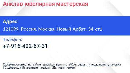 Анклав, ювелирная мастерская по адресу 121099, Россия, Москва, Новый Арбат, 34 ст1 в дальнейшем Организация, размещена в следующих категориях: