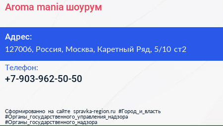 Aroma-mania, шоурум по адресу 127006, Россия, Москва, Каретный Ряд, 5/10 ст2 в дальнейшем Организация, размещена в следующих категориях: