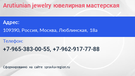 Arutiunian jewelry, ювелирная мастерская по адресу 109390, Россия, Москва, Люблинская, 18а в дальнейшем Организация, размещена в следующих категориях: