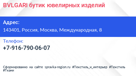 BVLGARI, бутик ювелирных изделий по адресу 143401, Россия, Москва, Международная, 8 в дальнейшем Организация, размещена в следующих категориях: