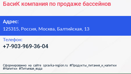 БасиК, компания по продаже бассейнов по адресу 125315, Россия, Москва, Балтийская, 13 в дальнейшем Организация, размещена в следующих категориях: