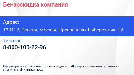 Бензоскидка, компания по адресу 123112, Россия, Москва, Пресненская Набережная, 12 в дальнейшем Организация, размещена в следующих категориях: