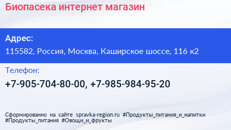 Биопасека, интернет-магазин по адресу 115582, Россия, Москва, Каширское шоссе, 116 к2 в дальнейшем Организация, размещена в следующих категориях: