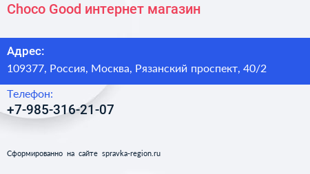 Choco-Good, интернет-магазин по адресу 109377, Россия, Москва, Рязанский проспект, 40/2 в дальнейшем Организация, размещена в следующих категориях: