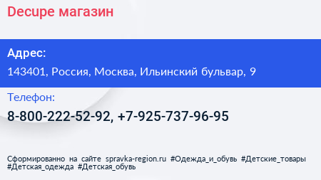 Decupe, магазин по адресу 143401, Россия, Москва, Ильинский бульвар, 9 в дальнейшем Организация, размещена в следующих категориях: