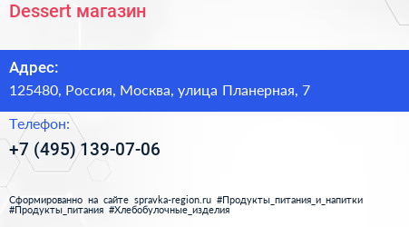 Dessert, магазин по адресу 125480, Россия, Москва, улица Планерная, 7 в дальнейшем Организация, размещена в следующих категориях: