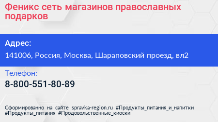 Феникс, сеть магазинов православных подарков по адресу 141006, Россия, Москва, Шараповский проезд, вл2 в дальнейшем Организация, размещена в следующих категориях: