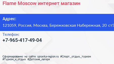Flame Moscow, интернет-магазин по адресу 121059, Россия, Москва, Бережковская Набережная, 20 ст5 в дальнейшем Организация, размещена в следующих категориях: