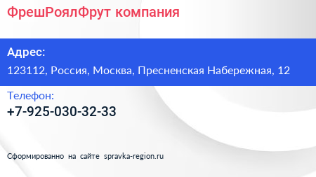 ФрешРоялФрут, компания по адресу 123112, Россия, Москва, Пресненская Набережная, 12 в дальнейшем Организация, размещена в следующих категориях: