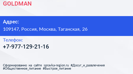 GOLDMAN по адресу 109147, Россия, Москва, Таганская, 26 в дальнейшем Организация, размещена в следующих категориях: